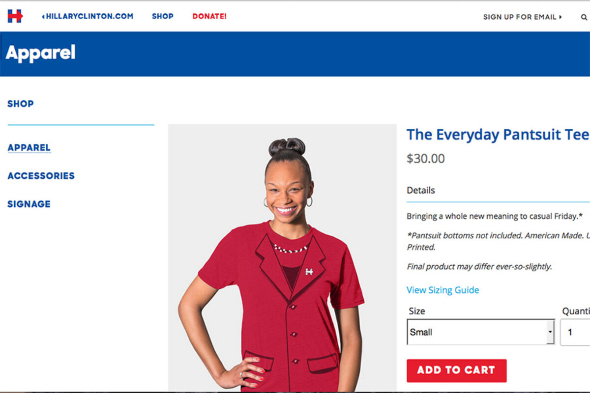 The 'it' item? A $30 a red T-shirt (unisex!) with a screen-printed suit, pearls, and Hillary pin on the front. On the back, the words, "Pantsuit Up."
