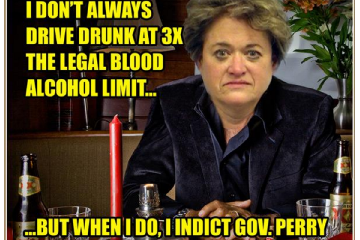 The caption on the tweet reads: "I don't always drive drunk at 3x the legal blood alcohol limit ... but when I do, I indict Gov. Perry for calling me out about it. I am the most drunk Democrat in Texas."