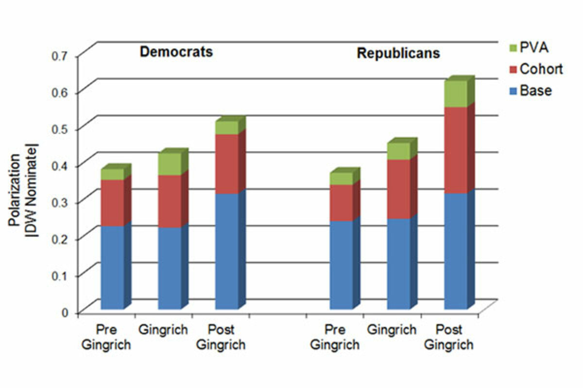In both projects, Theriault and Mr. Rohde refer to the House鈥檚 effect on Senate polarization as a consequence of a peculiar cohort of lawmakers they call the 鈥淕ingrich Senators.鈥 In simple terms, their work identifies Republican senators who came from the House after Gingrich鈥檚 election (from 1978-2010) as key to explaining the Senate鈥檚 polarization. My results, by comparison, show that the underlying causes of this effect are not isolated to Newt Gingrich or the Republican Party but are, instead, part of a more broadly generalizable behavioral process. In fact, some of the most partisan senators in the past decade (Jim DeMint, Pat Toomey, and David Vitter) entered in the House after Gingrich had resigned.