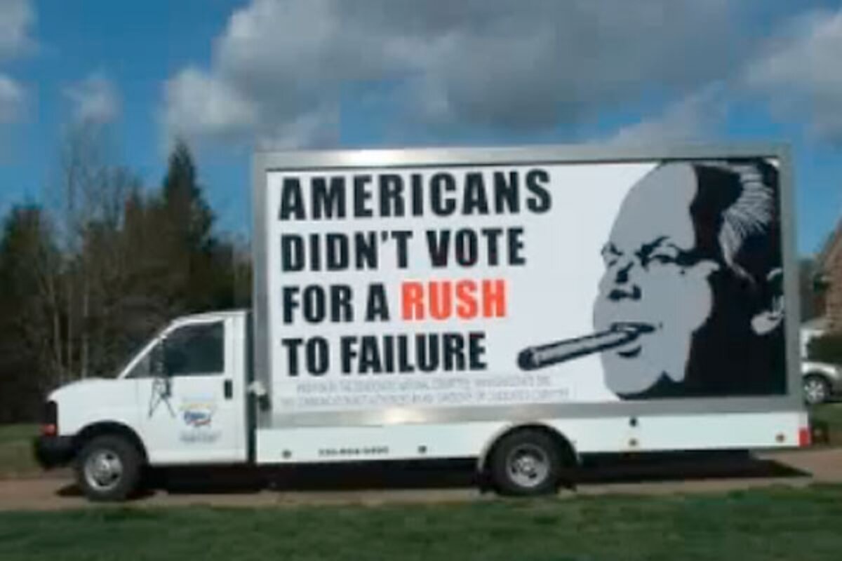 "America didn't vote for a Rush to failure" announces the sign complete with Limbaugh's likeness and cigar to boot.