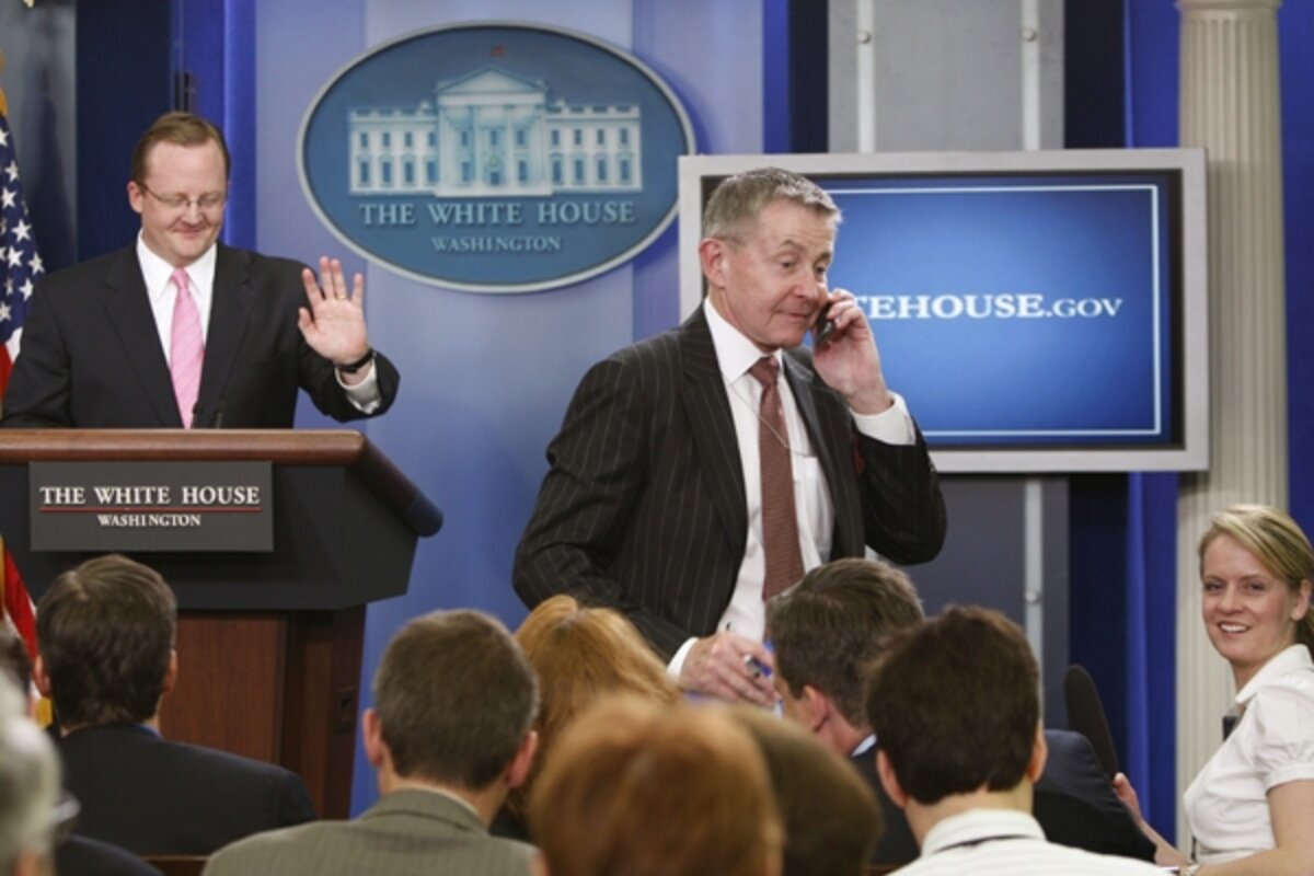 To much laughter, Gibbs strode from the podium and put out his hand demanding the phone. The reporter complied and Gibbs walked back to his office door and threw the phone out. (Someone allegedly caught it).