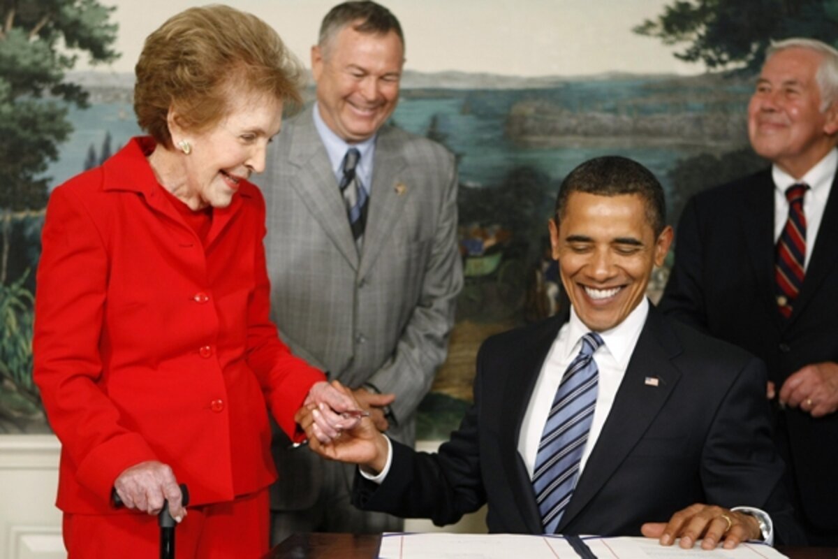 Former First Lady Nancy Reagan was back at the White House today and while President Obama was signing a bill to establish a Commission honoring her late husband's 100th birthday, she remarked, "Oh, you're a lefty..."
