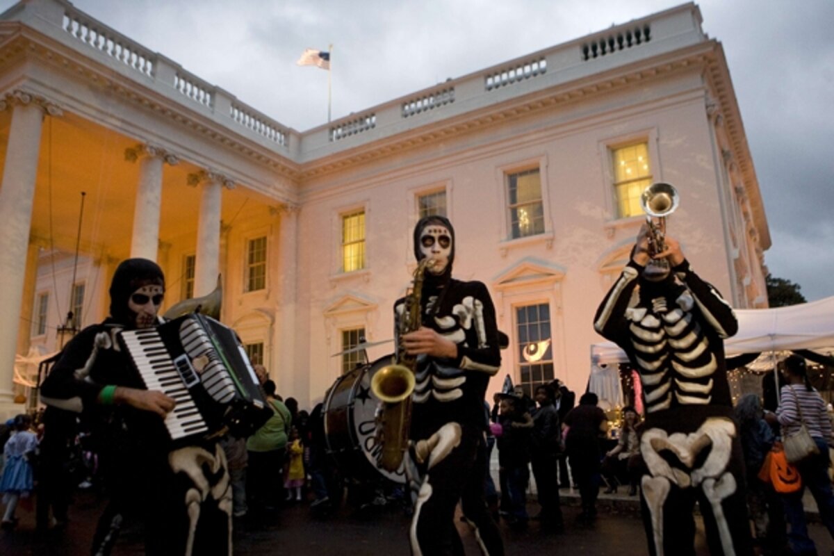As we told you earlier, more than 2,000 kids in the DC area got to trick or treat at the president's house today. They were greeted by a Chicago-based jazz band appropriately clad in skeleton costumes while Star Wars creatures and other costumed performers roamed the North Lawn among giant 1,000 pound pumpkins.
