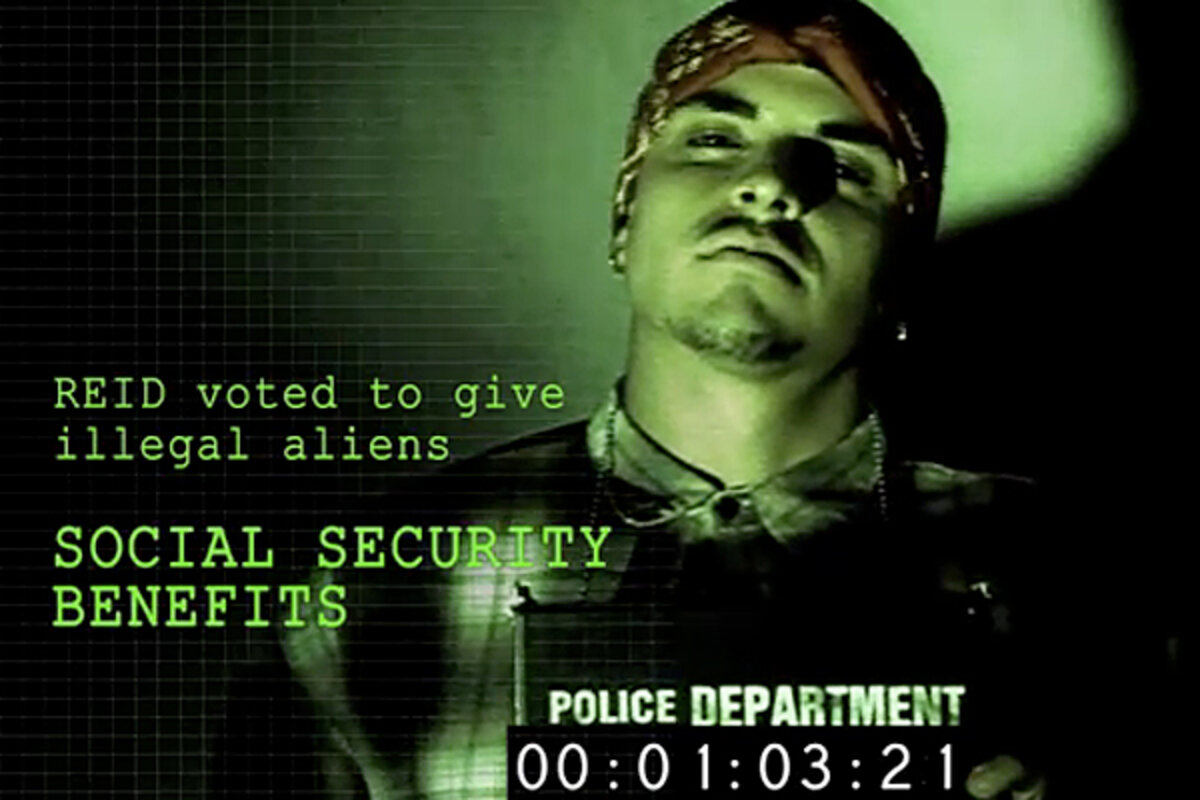 Sharron Angle has a new ad up that features Hispanic-appearing men carrying weapons and appearing in police mug shots. In the ad, she alleges that her opponent, incumbent Sen. Harry Reid (D) of Nevada, is soft on illegal immigrants.