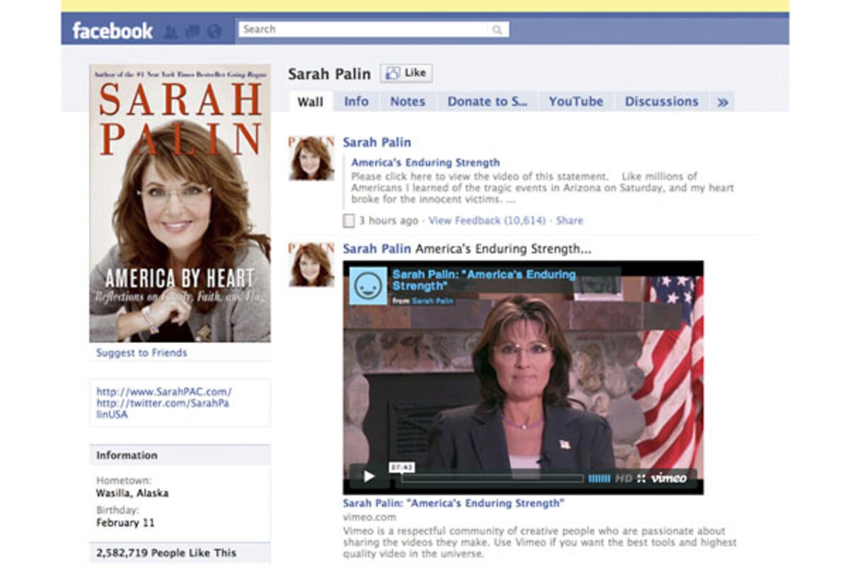 Wednesday morning, the 2008 GOP vice-presidential nominee posted an eight-minute video on her Facebook page, expressing sadness and shock over the tragedy in which six people died and Rep. Gabrielle Giffords (D) of Arizona was gravely wounded. Then former Governor Palin waded into the red-hot controversy over political rhetoric and its possible role in inciting the killer.
