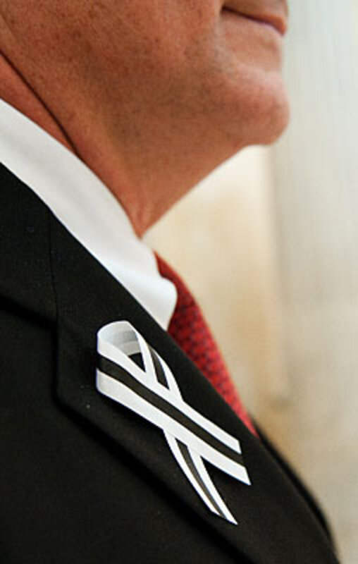 "The tragic shooting on January 8th wounded our friend and colleague, Rep. Gabrielle Giffords, and caused the deaths of six and wounding of twelve others. The black/white ribbon has been a symbol of unity and hope for the entire Tucson community in the wake of this event. The white ribbon represents hope for a peaceful, nonviolent society. The black ribbon is in remembrance of all who have died and been wounded as a result of violence.