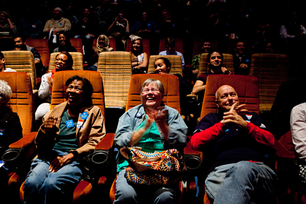 Time now to migrate to the Obama tribe, gathered in a movie theater at the Ohio State University (OSU). We walk in to a sea of faces 鈥 mostly college students, some campaign volunteers and staff, and the Democratic nominee for Ohio鈥檚 Third聽Congressional District, Joyce Beatty 鈥 all trained on giant Romney and giant Obama on the big screen. It鈥檚 tuned to MSNBC, of course.聽
