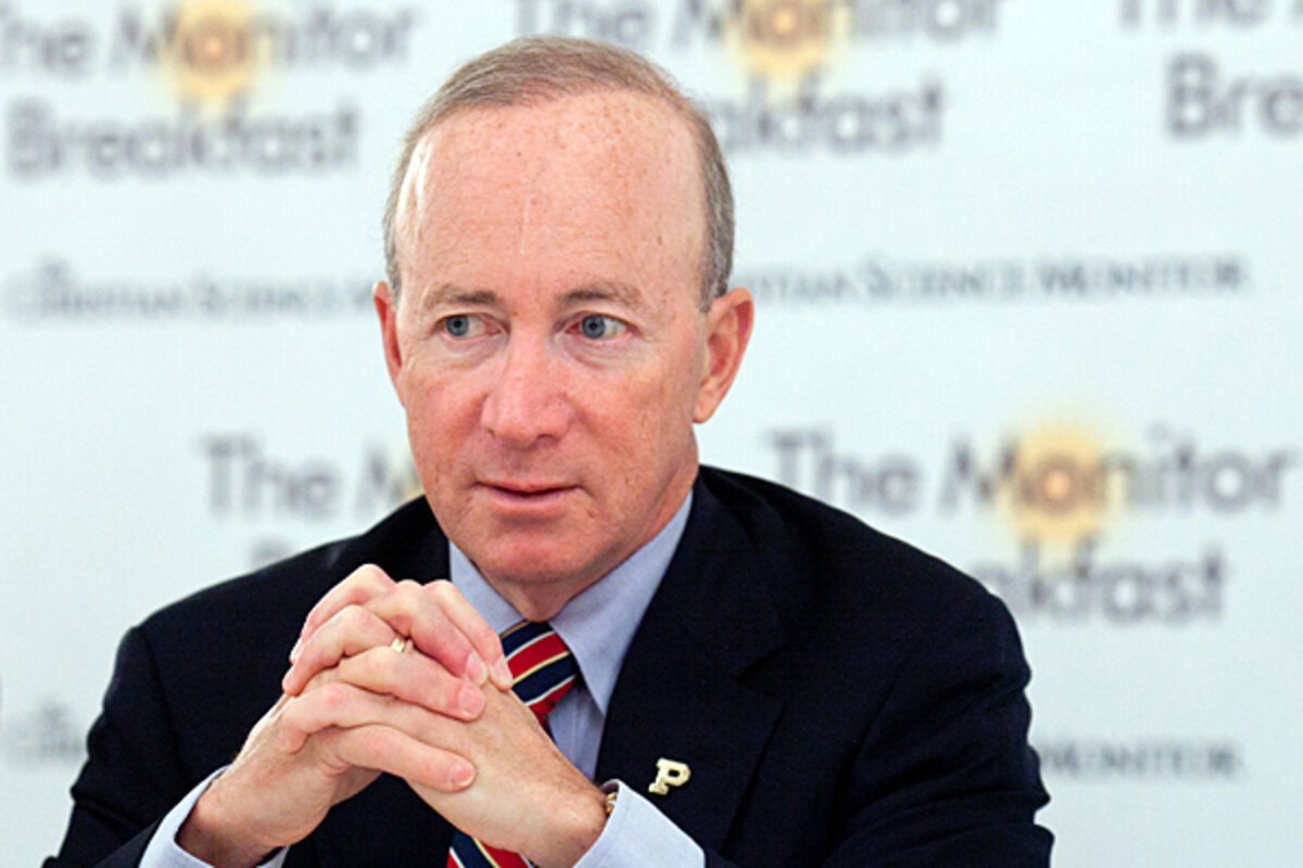 Purdue University 笔谤别蝉颈诲别苍迟听Mitch Daniels, director of the Office of Management and Budget under George W. Bush and a two-term Republican governor of Indiana before assuming his current role in 2013, was the guest at the Oct. 30 Monitor Breakfast.
