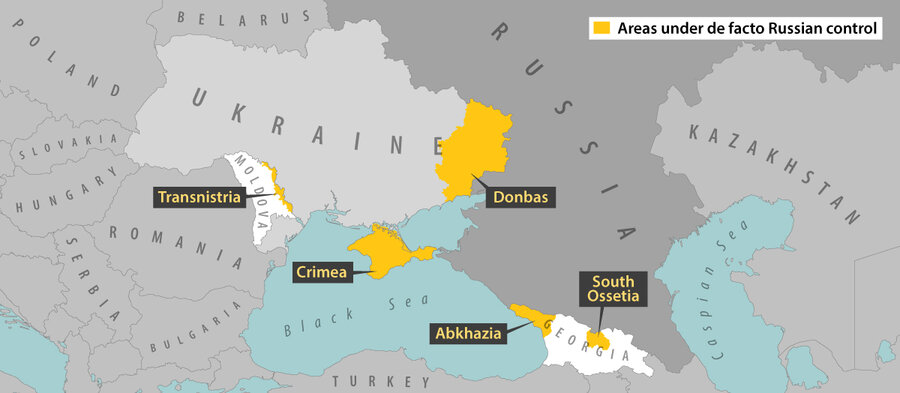 The Georgian regions of Abkhazia and South Ossetia, first occupied in 2008 and representing one-fifth of Georgia’s territory, are still under Russian control. In Ukraine, the 2014 Russian annexation of Crimea and backing of separatists in the eastern Donbas added another expansionist toehold by Moscow.