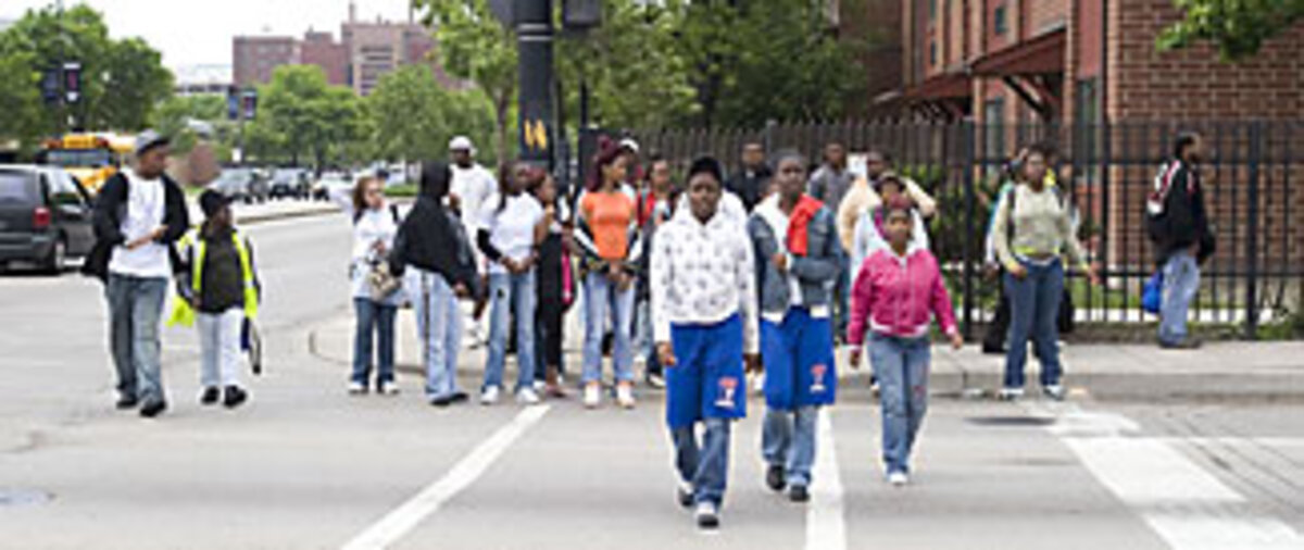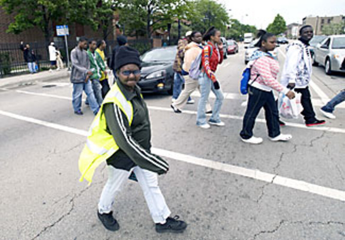 Every weekday morning, parents and volunteers, wearing bright yellow shirts and neon jerseys, join with police to accompany up to two dozen students from ABLA Homes, a Chicago public housing project, to the Richard T. Crane Technical Preparatory Common School two miles away. In the afternoon, they make the return trip, including the ride on the city bus.
