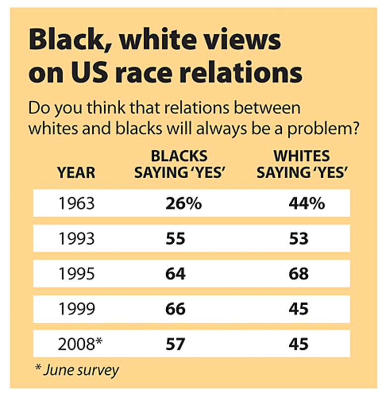 A recent Gallup Poll shows significant gaps persist in how black and white Americans understand race relations. When pollsters in 1963 first began asking the question, "Do you think that relations between whites and blacks will always be a problem?" some 26 percent of black respondents, compared with 44 percent of whites, said yes. In a poll last month, white Americans were more optimistic on the prospects for racial reconciliation: Fifty-seven percent of blacks expected that race relations would always be a problem, compared with 45 percent of whites.