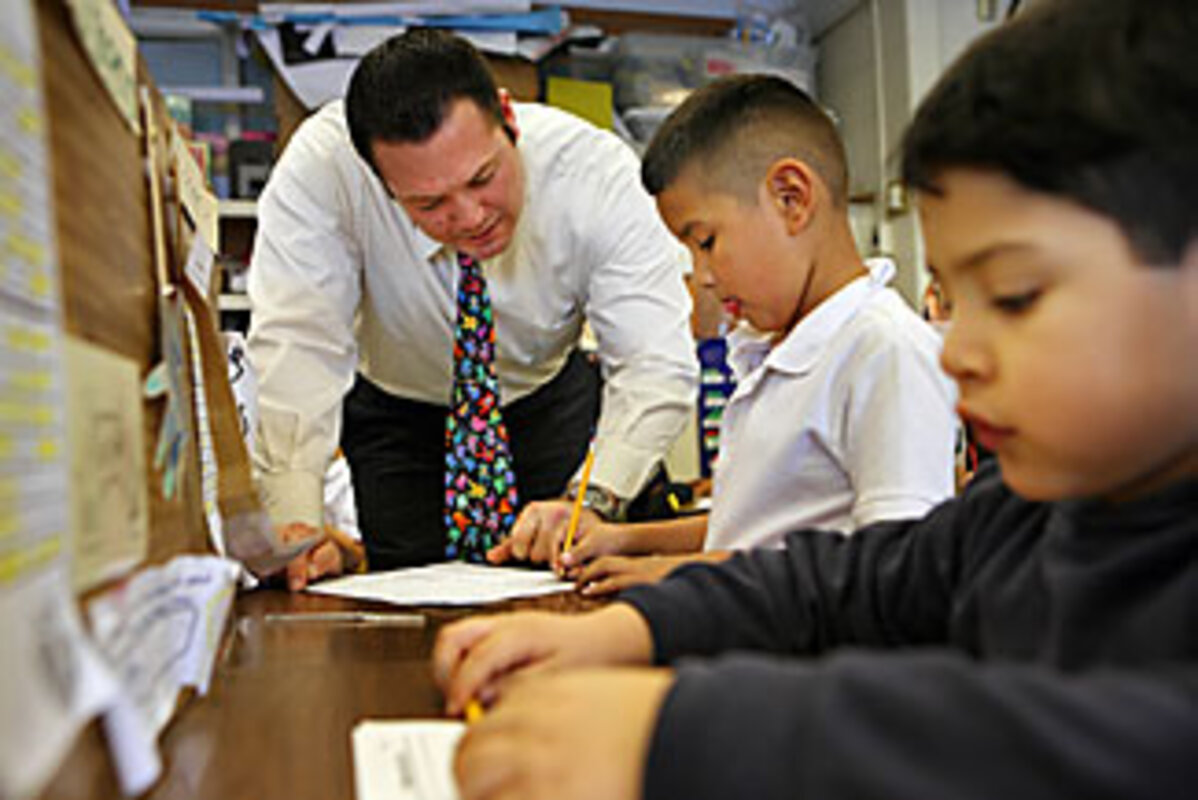 On one recent day, that included a quiz on telling time. Namba has the student who received the only perfect score help some of the others. "Cristian knows how to tell time," he says. "He's available to help others."