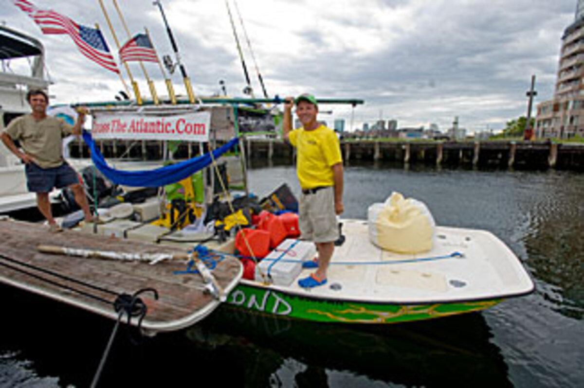 Still, it took another four years for Ralph to make good on his promise. With Bob, a salty surfer happily along for the ride, Ralph is skippering the fishing boat he designed in an attempt to break the Guinness Book of World Records for the longest unaccompanied oceanic voyage in a flat-bottom boat. They left Tampa, Fla., on June 27 and aim to arrive in Frankfurt, Germany, by the end of August. He hopes the attention paid to his daring and dangerous trip encourages supporters to "do more than just say thanks" to those who serve in the armed forces.