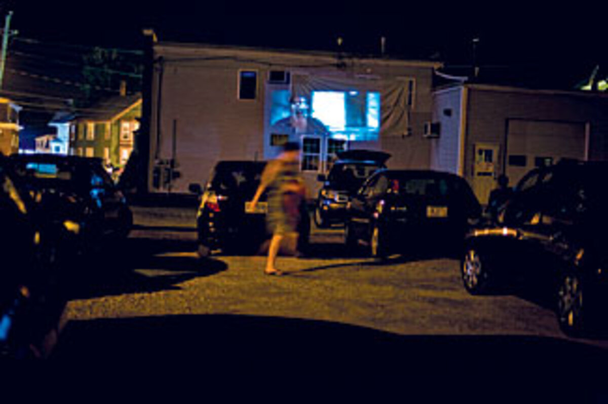 On a July evening, Larry Clow and Bryan White hang two white dropcloths from the back of a gas station in Dover, N.H., to screen the 1979 flick, "The Warriors." They prep the projector and switch on an FM transmitter as 10 cars pull into a gravel parking lot to enjoy the show. It's not unlike the first drive-in movie theater experience.