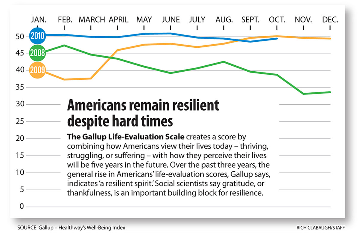 The latest Gallup "life evaluation" poll, which measures how Americans view their lives in the present and in the near future, showed the highest scores in three years in May and a slow but steady climb since November 2008 鈥 a sign, Gallup says, of "ferocious resilience."
