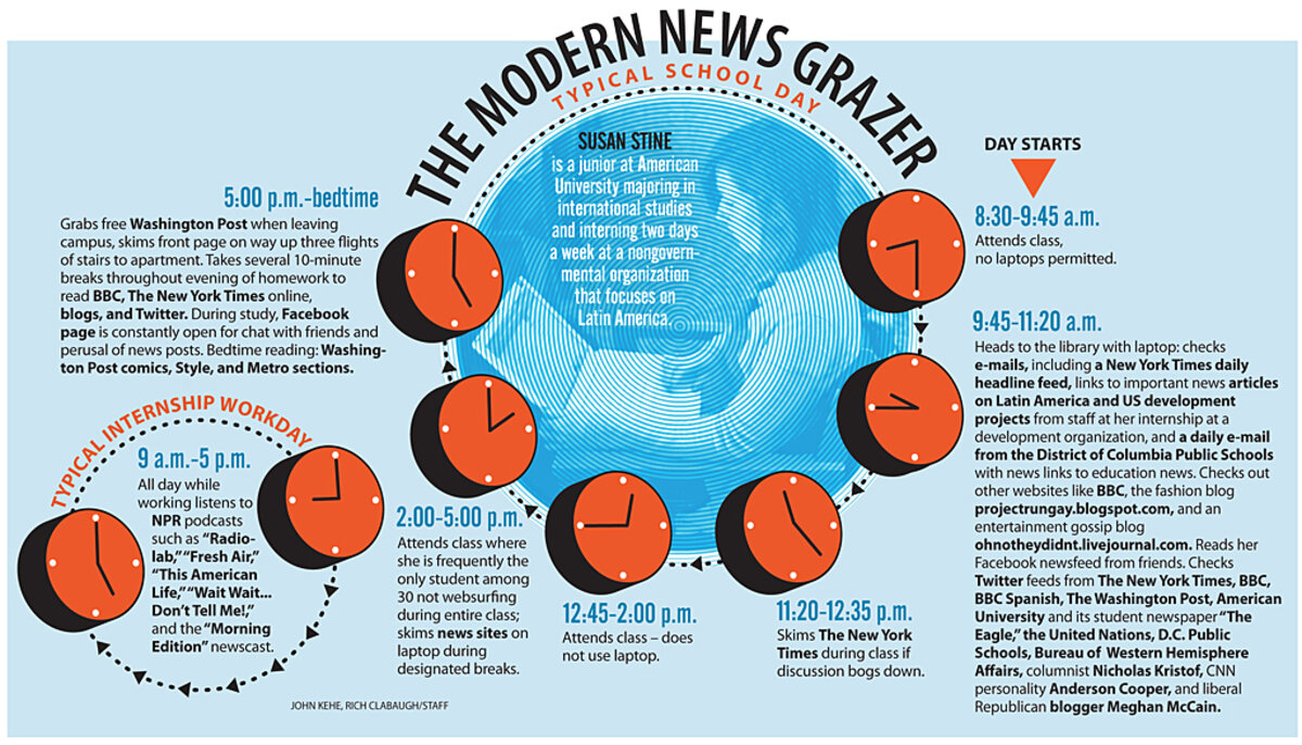 Stine says a normal day for her is rolling out of bed to catch an 8:30 class or go to work with little time to read the day's news. She catches up in an ad hoc fashion at odd moments. Her first check-in with headlines often happens in class, if things get dull, or immediately afterward between classes. She figures that over the course of the day, she opens her laptop 10 times and cycles through a list of outlets reading about Libya after her early class or about fashion after lunch. And, like other online news consumers, she has essentially created her own digital newspaper based on her quirks and interests.
