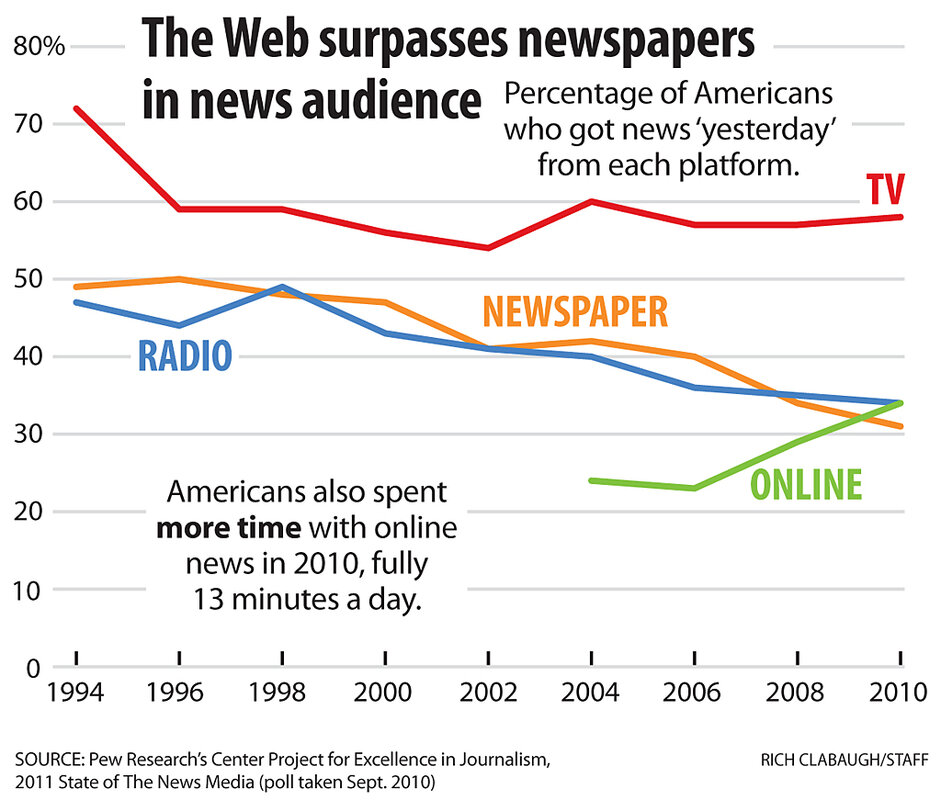 In the past four years, newspaper revenue has dropped 48 percent. Network TV saw a better 2010, but the trend since 2000 is unmistakably down 鈥 or up only because of staff cuts.