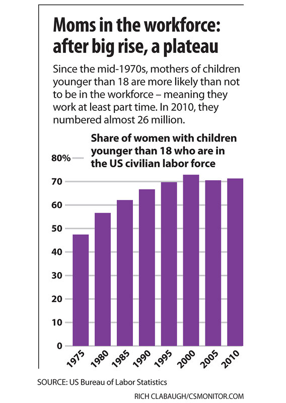 Nonetheless, many things have changed dramatically for working mothers in the last 40 years. For starters, there are simply many more of them. In 1975 some 47 percent of mothers were in the labor force (defined as working or looking for work), according to the US Bureau of Labor Statistics. That number grew steadily in the '80s and '90s, peaking at almost 73 percent in 2000.