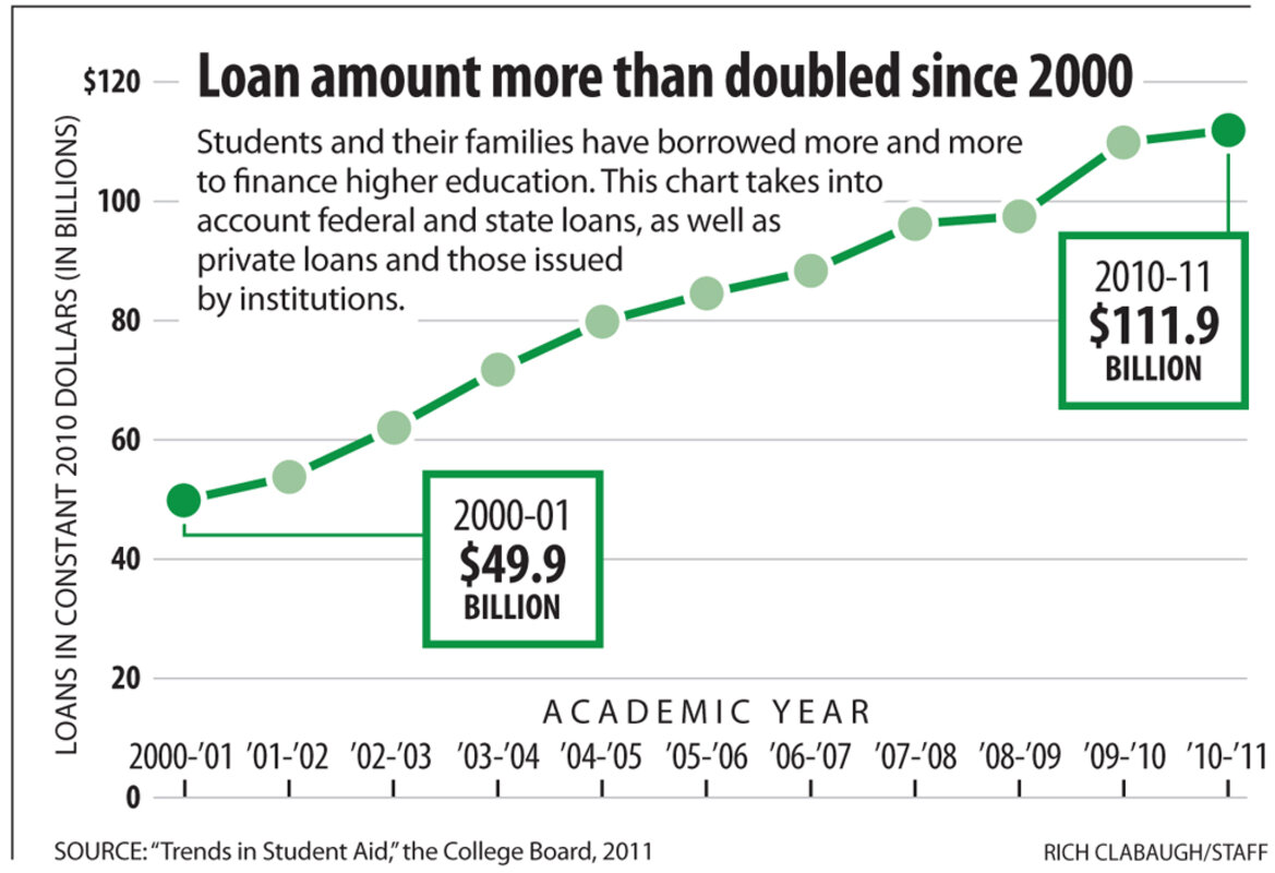 Collectively, the college loan bill in America comes to at least $1 trillion, the largest consumer debt sector outside of home mortgages, reports the Consumer Financial Protection Bureau. This indebtedness, moreover, is concentrated among people younger than 40 鈥 and it is accelerating much faster than the rate of inflation. The average college loan debt per student is nearing $27,000 鈥 triple the average in 1992 鈥 as a result of the soaring cost of college.