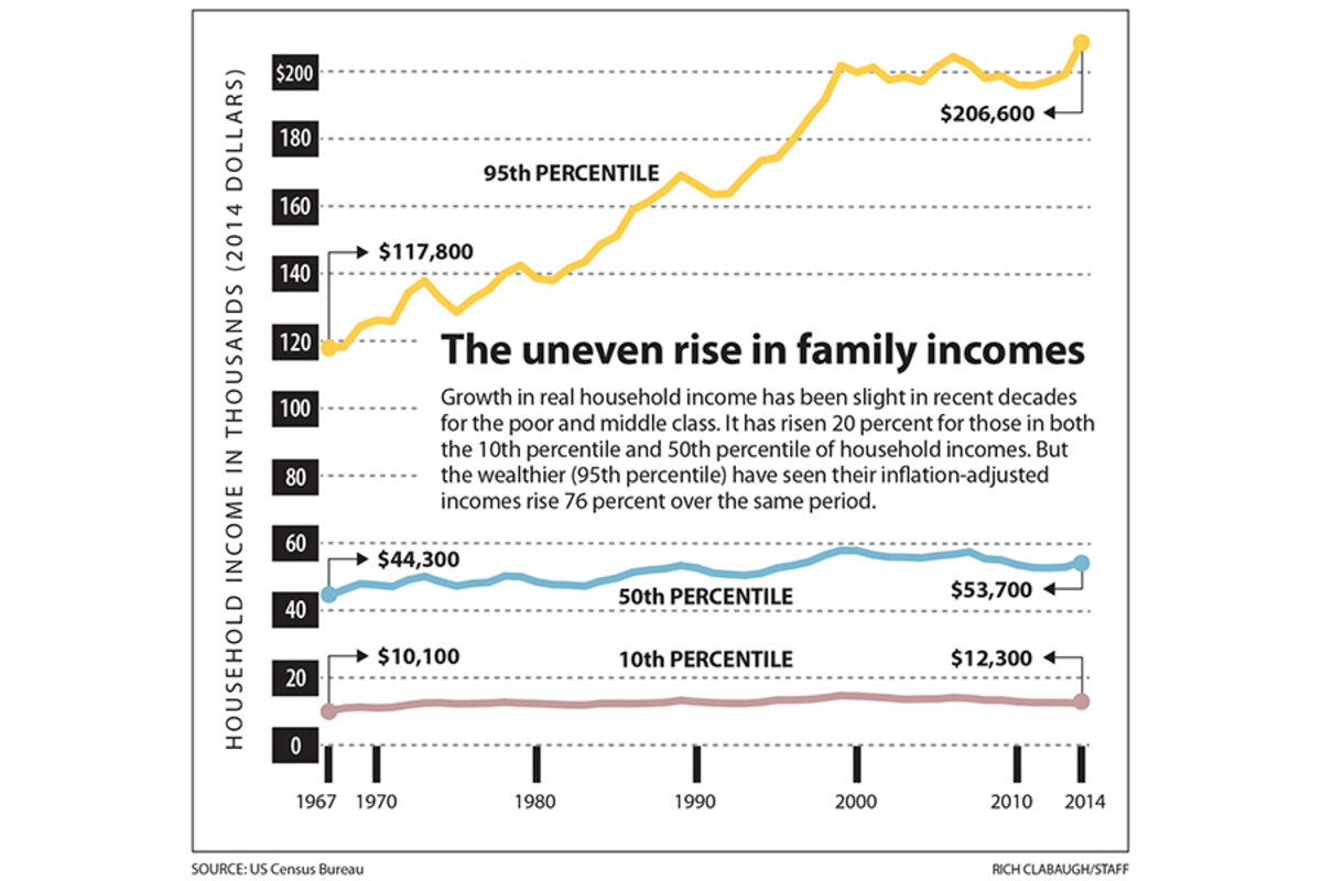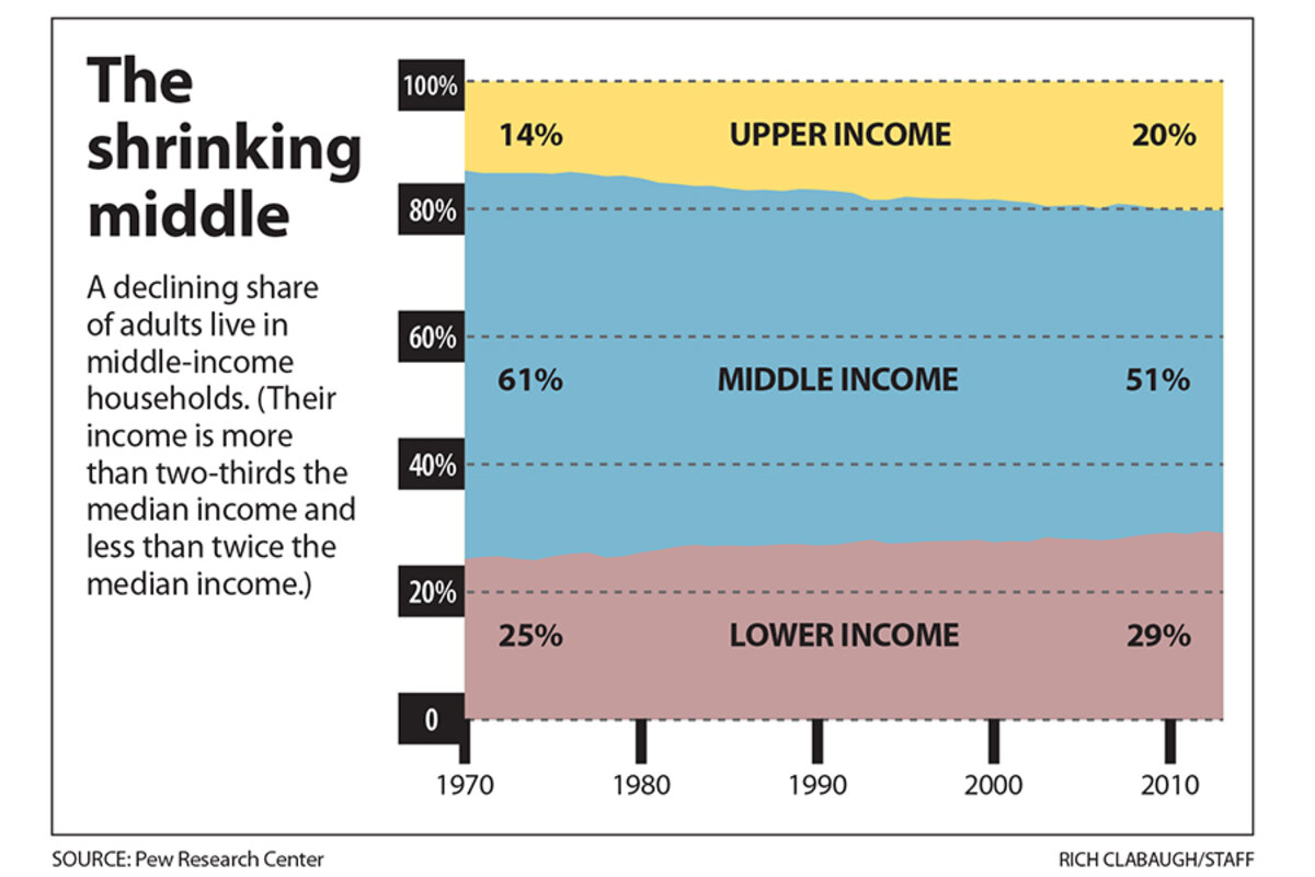 The middle class is being redefined partly by demographics. In 1970, fully 40 percent of US households were married couples with at least one child under 18 years old. By 2012 that share had declined to 20 percent of US households 鈥 a shift that includes more single-parent breadwinners. It鈥檚 also being redefined by a changing job market 鈥 notably by the rising importance of education on r茅sum茅s, as well as the disappearance of punch-the-timecard jobs in offices and factories that once produced comfortable lifestyles but were vulnerable to automation.聽