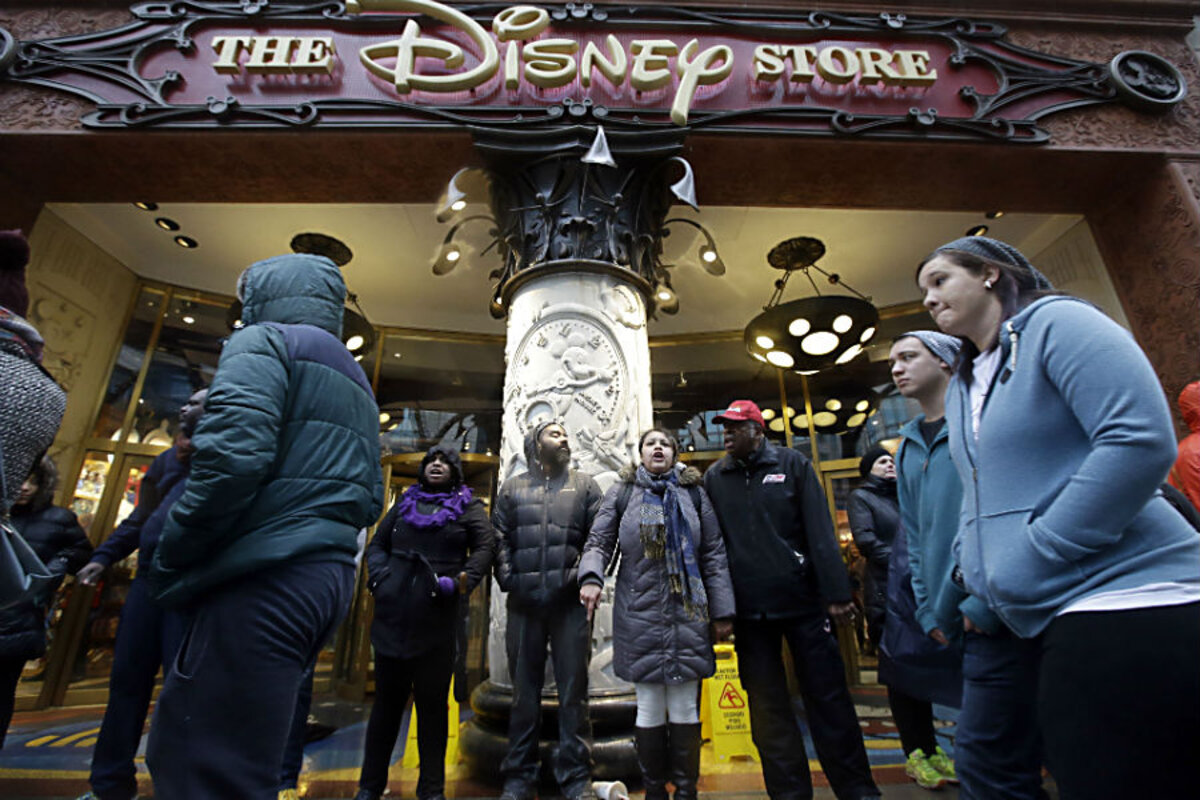 When one person tried to get through the front door of Saks Fifth Avenue, protesters screamed at him, shouting, "Shut it down! Shut it down." Entrances were also blocked at the Disney Store, the Apple Store, Nike, Tiffany & Co., and Neiman Marcus, among others.