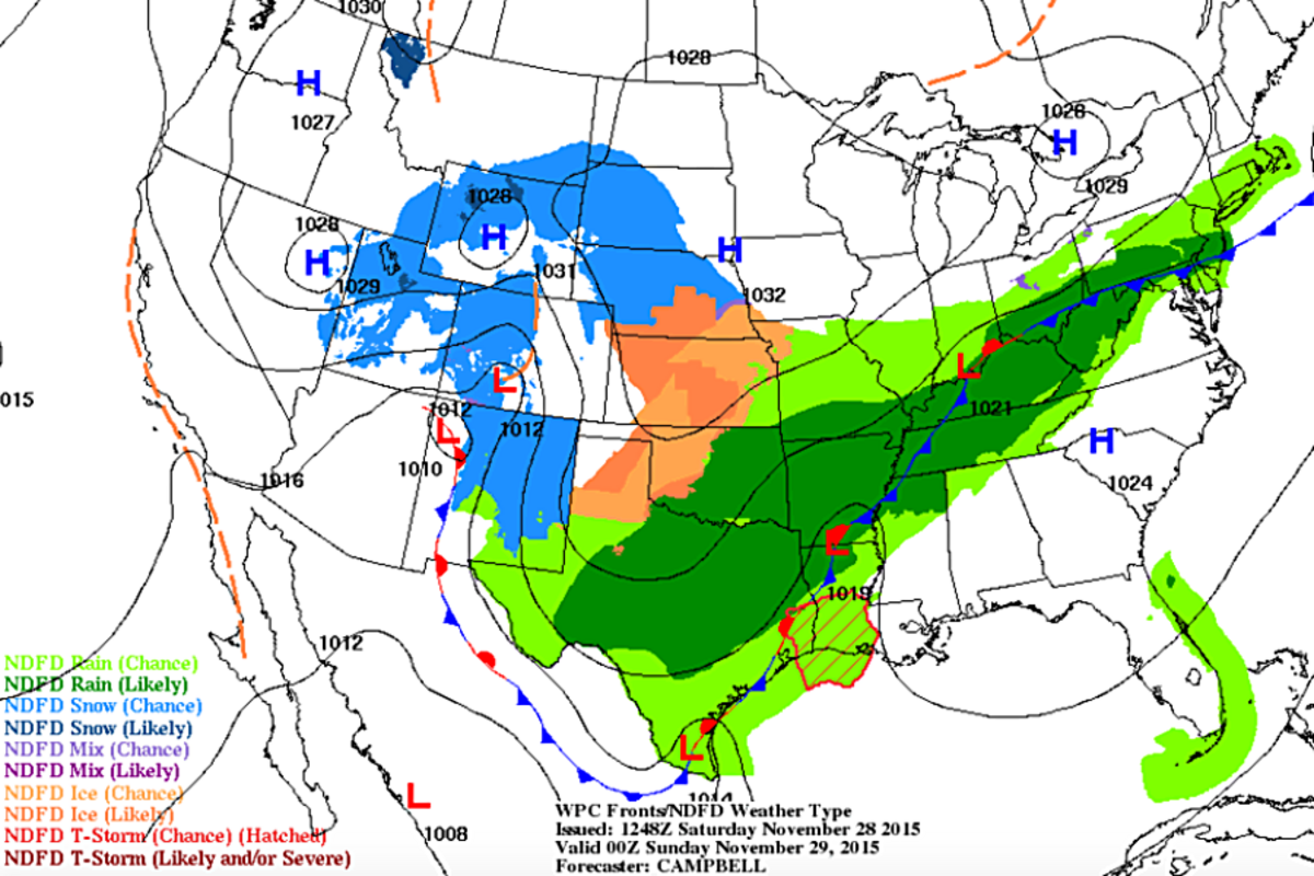 Freezing rain first developed in the early morning hours of Thanksgiving in parts of northeast Colorado, eastern聽Wyoming, Nebraska and southern Minnesota and has spread southward along with the advance of cold air.