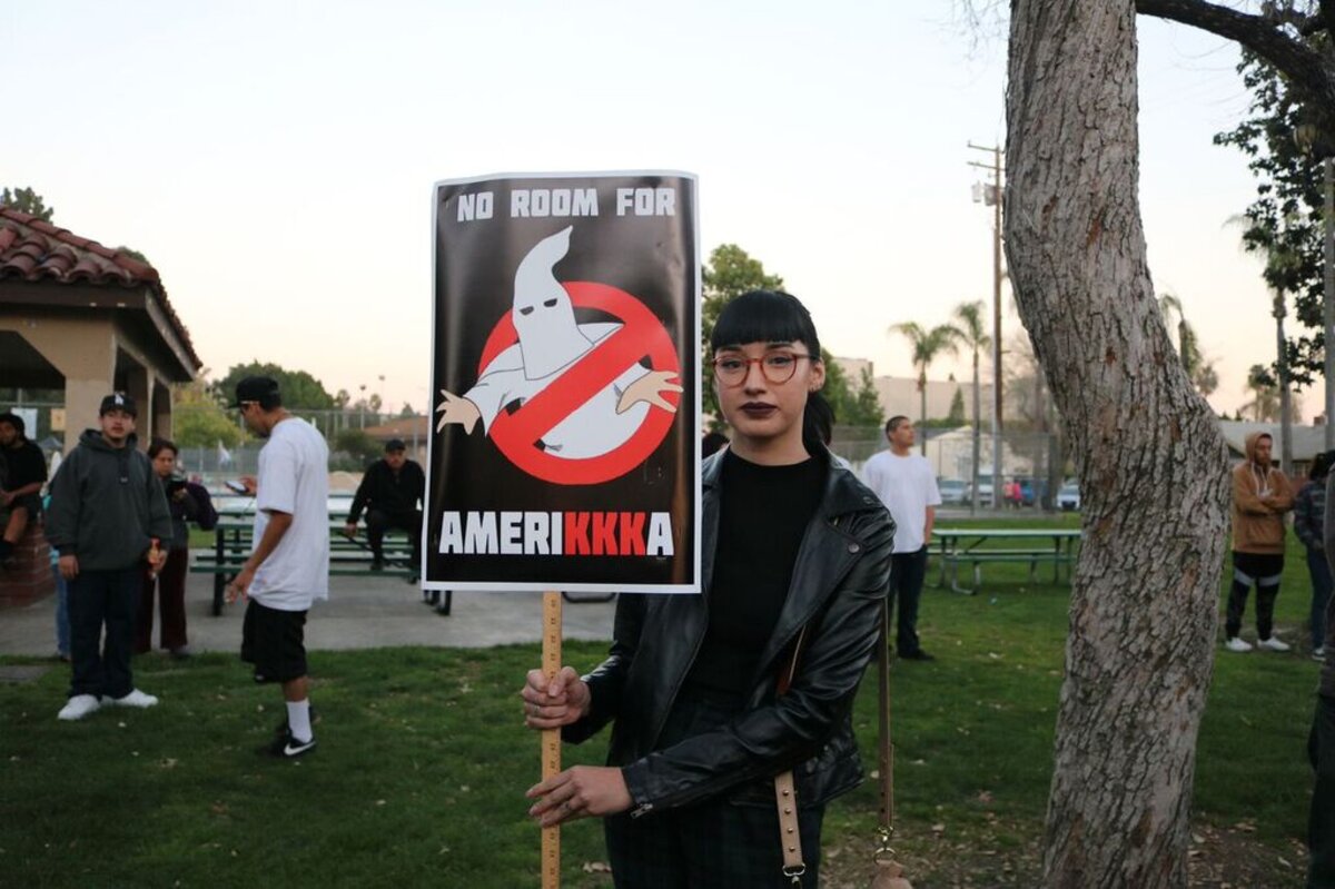 People begin to turn up for the vigil at Pearson Park in downtown Anaheim just before sundown. Volunteers hand out colorful signs. Organizers set up a small stage and podium for the press conference, scheduled for 6 p.m.