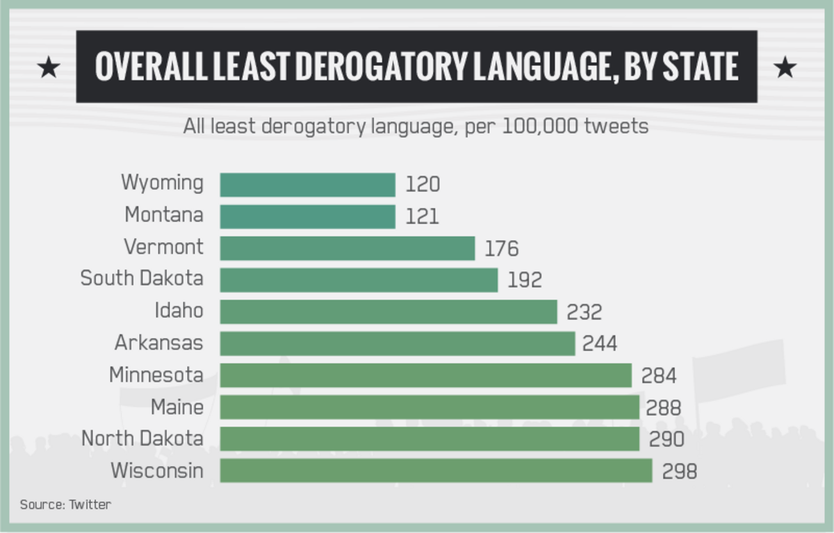 People tweeting the least derogatory language live in Wyoming (120), Montana (121), and Vermont (176), according to Abodo鈥檚 analysis.