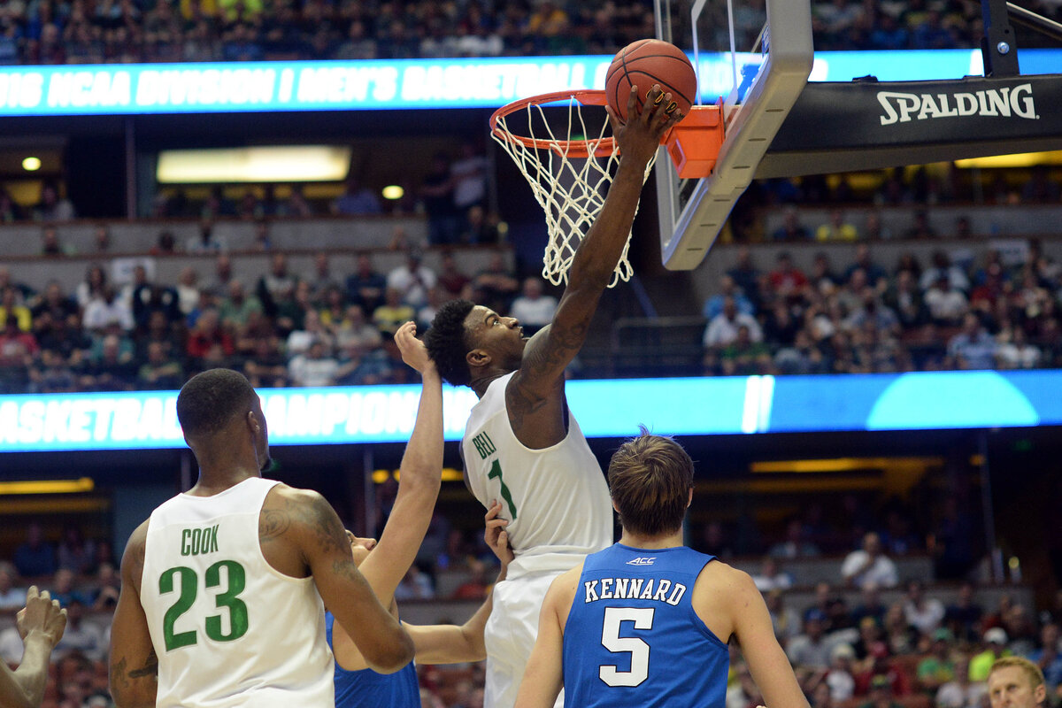 Also in the West, and with Los Angeles Lakers star Kobe Bryant in the house, top seed Oregon faced fourth-seeded Duke in the night's late game. Though the Blue Devils kept it close in the first half, the in the second, with four of their starters finishing in double figures 鈥 led by Dillon Brooks (22 points) and Elgin Cook (16). For Duke, Brandon Ingram (24) and Grayson Allen (15) led the Blue Devils. Oregon will now face Oklahoma for a trip to the Final Four on Saturday.