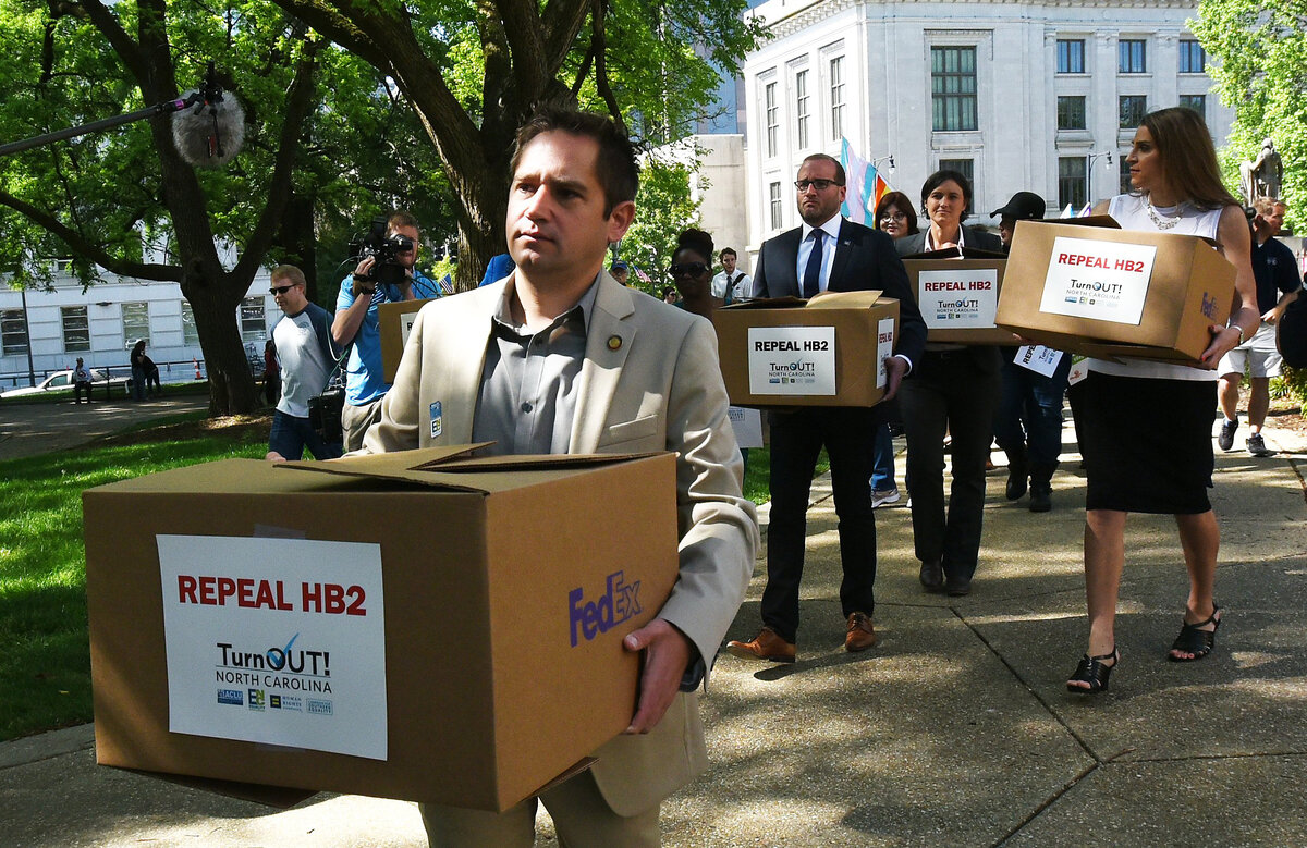 Opponents of the North Carolina law that requires transgender people to use the bathroom that corresponds with the gender on their birth certificate delivered petitions with around 180,000 signatures to the state's Capitol on Monday.