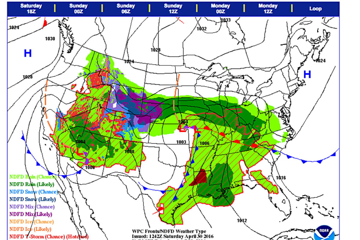 By Sunday evening, rain with embedded thunderstorms will develop over聽parts of Central/Southern California and extend eastward to parts of the聽Southern High Plains.聽 Also on Sunday, moisture from the Gulf of Mexico聽will move westward over the Western Gulf Coast into parts of Western Texas聽producing showers and thunderstorms over the region. 聽聽