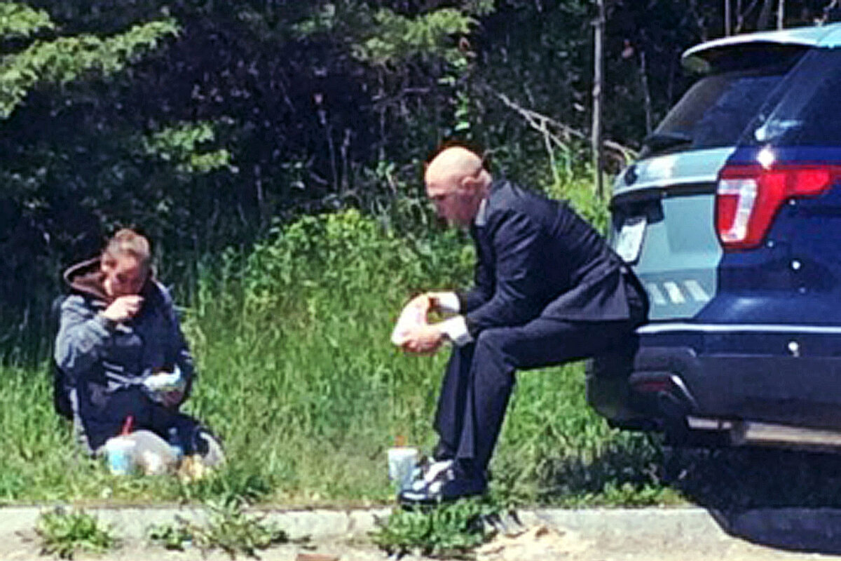 He told her to pick a meal, and they shared a picnic and a conversation by the roadside. A photo of the meal was shared on social media and attracted thousands of likes and shares. The unseen photographer, Jake Morse of Massachusetts, told The Herald News he聽was glad the photo was turned over to the police, so credit went back to the officer.
