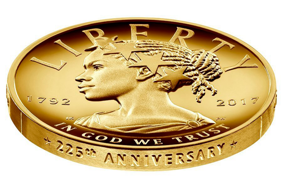 On Thursday, the Mint . The coin 鈥 a $100 collector鈥檚 item struck in 24-karat gold 鈥 features Lady Liberty, for the first time portrayed as an African-American woman. She wears a crown of stars聽and is surrounded by the inscriptions 鈥淟iberty,鈥 鈥淚n God We Trust,鈥 and the dates of the Mint鈥檚 anniversary.
