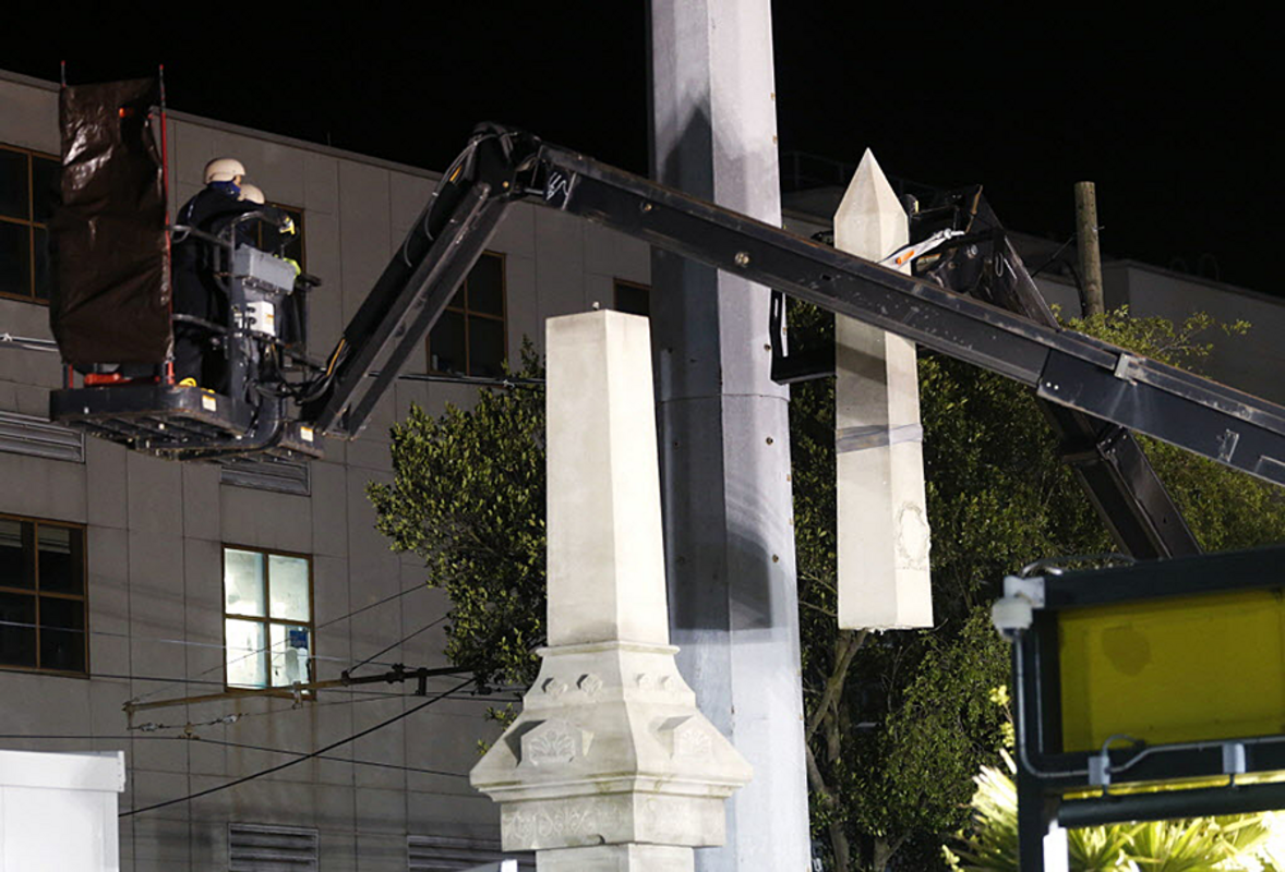 Workers who took the monument down Monday could be seen wearing bulletproof vests, military-style helmets and scarves that obscured their faces. Police were also on hand, including officers who watched the area from atop the parking garage of a nearby hotel.