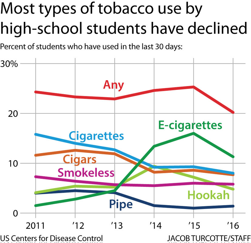 Experts are especially encouraged by the first decline in e-cigarettes, the most popular tobacco product among teens. In 2016, 11.3 percent of high school students reported using electronic cigarettes, down from 16 percent in 2015.