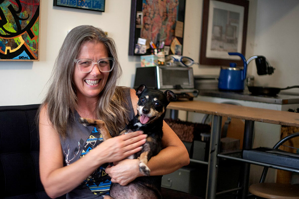Today Henderson makes about $37,000 a year as an executive assistant to a bar owner and lives in the Bristol Hotel, a mixed-use apartment building in the heart of downtown Los Angeles. Her studio, which she shares with her small dog Olive, is 175 square feet – the equivalent of about four king-size beds. The walls are covered in framed artwork that Henderson collected from thrift shops and friends. An apartment-sized fridge and a fold-out couch are her largest possessions.