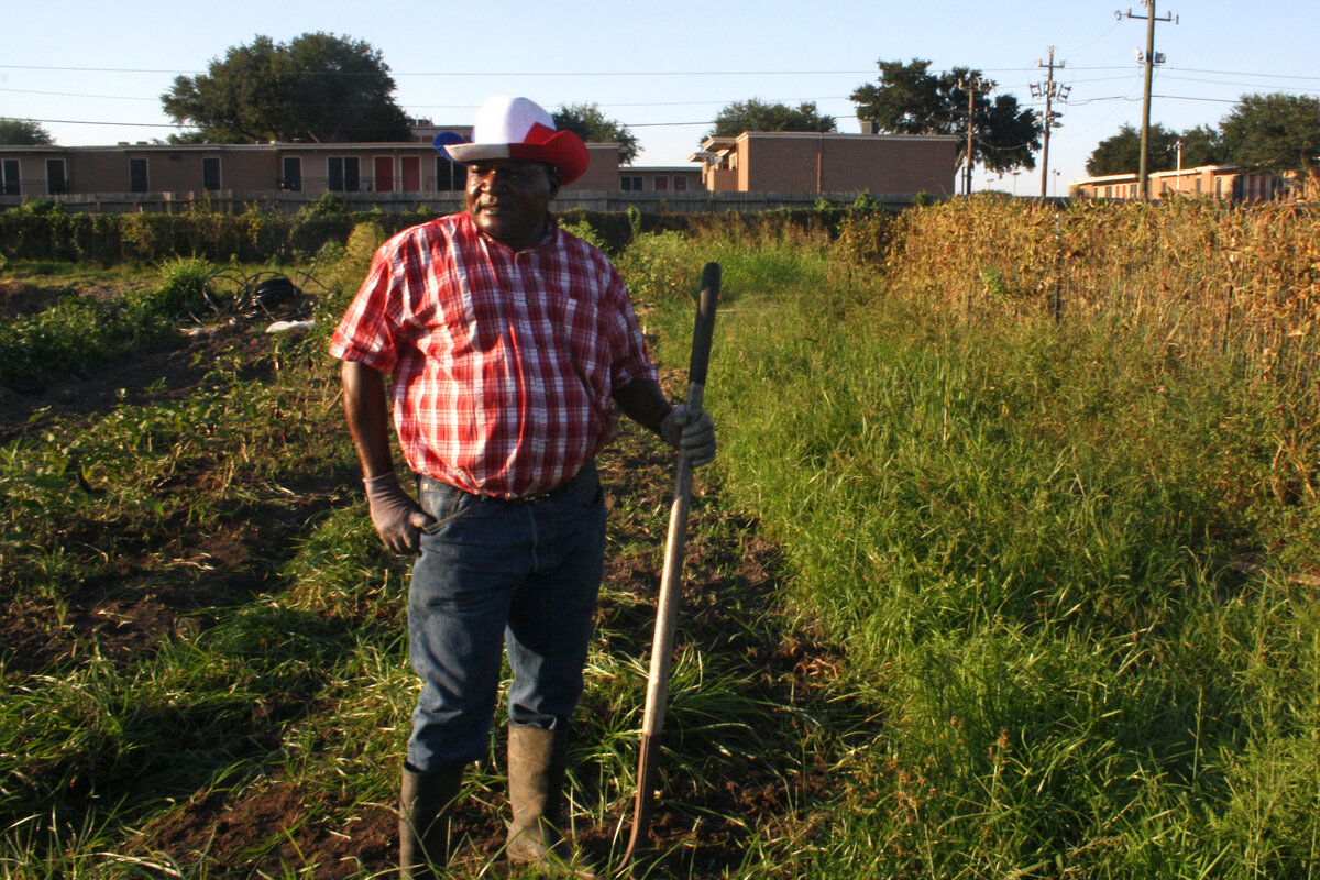 Sweat dripping from under his red, white, and blue cowboy hat, Guy Mouelet is standing in his farm at the corner of Fondren Road and Willowbend Boulevard here, taking a break between giant hacks with his shovel at the tangled green weeds that have overrun his eggplant bed. He recalls not thinking too much of hurricane Harvey before it broadsided Houston with days of torrential rain.