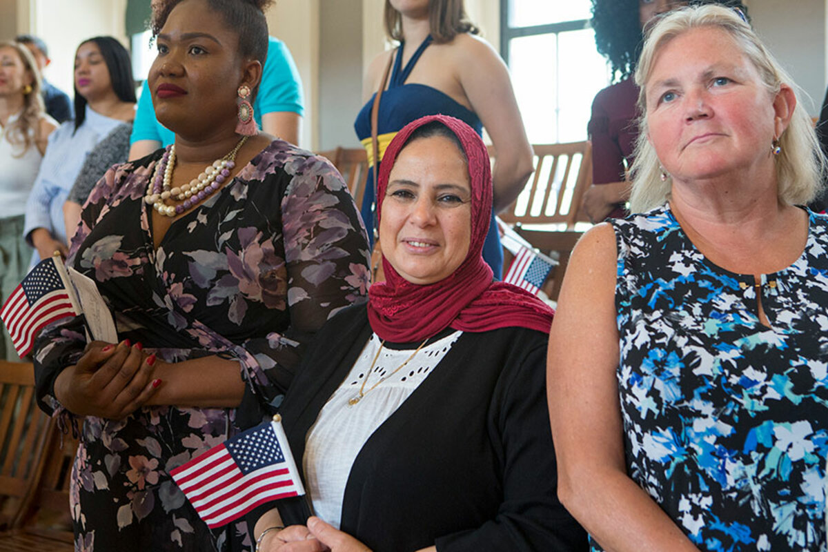 Ms. Omara, a small woman in a burgundy headscarf, is from Egypt. To her right, Mirlande Jean-Baptiste, from Haiti, wears a wildly floral dress, scarlet lipstick, and dangling earrings. To her left, Canadian Barbara Curran laughs at her new friend鈥檚 observation. All would become US citizens this afternoon, taking an oath in Boston鈥檚 Faneuil Hall, a stately building that once hosted the treasonous exhortations of Samuel Adams to dump English tea in the harbor.