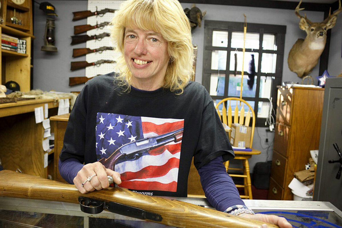 Down the street, Karen Dore hustles home from her job on the housekeeping staff of Maine General Hospital. At 5:30 every afternoon she opens the door to her garage, which has been converted into a store. An eagle-bedecked sign in the yard advertises Freedom Firearms.