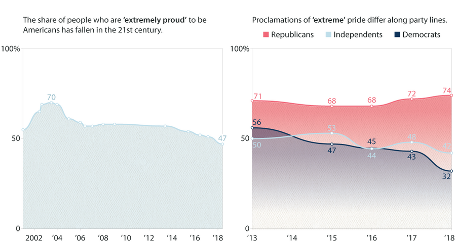 The Gallup polls found a 25 percentage-point gap between Republicans and Democrats on the question of national pride, the largest partisan gap Gallup has found since it began measuring in 2001. Soured by President Trump鈥檚 administration, fewer Democrats reported pride in their country than at any time in the past 16 years; Republicans remained high on Trump and on patriotism.