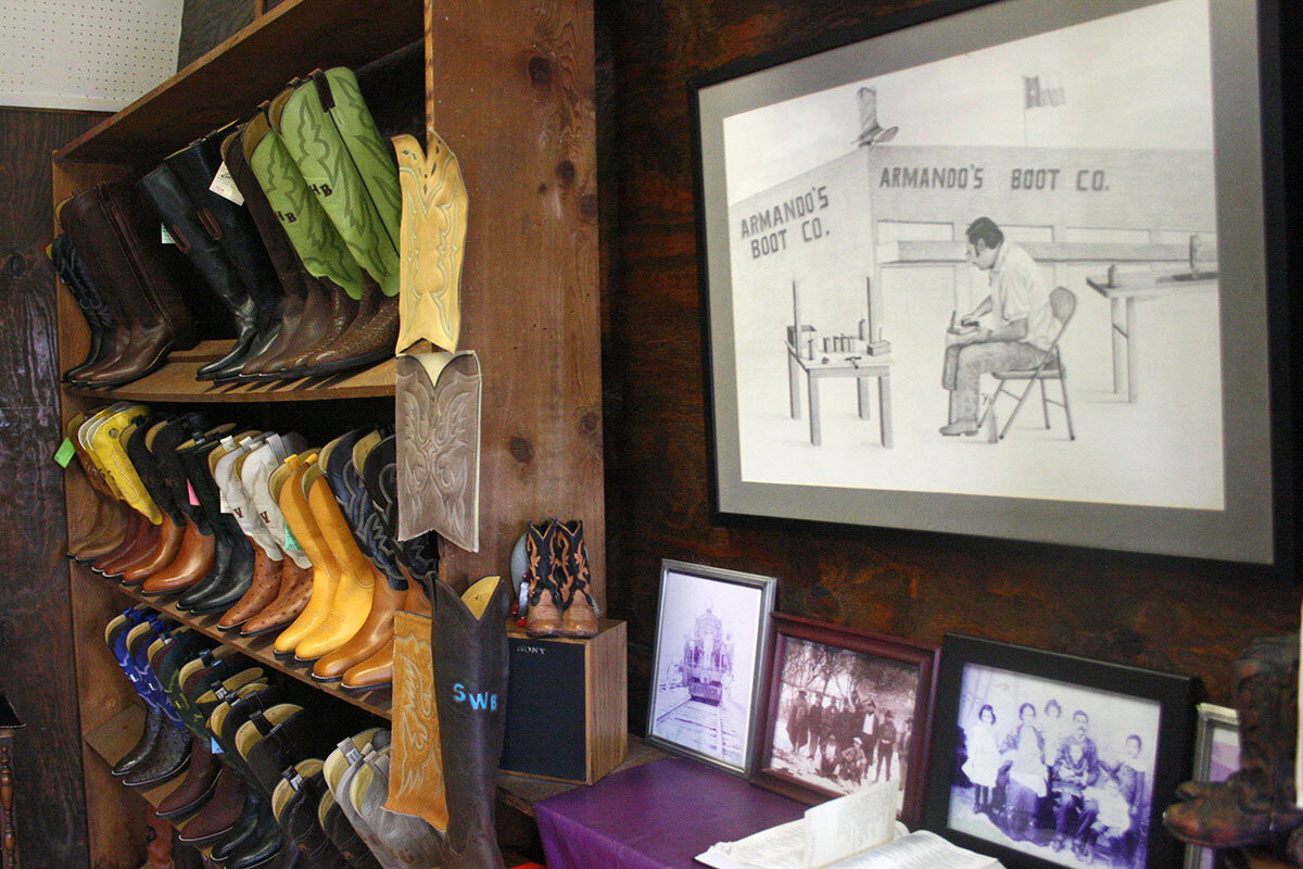Mr. Duarte learned bootmaking from his father, who learned it from his uncle in Mexico and opened in 1982. The cowboy boot towering over the front door is, along with a water tower painted with a smiley face, a landmark of the Raymondville skyline. Since the store ships boots to customers all over the country, Duarte says they have been relatively insulated from the recent economic struggles.
