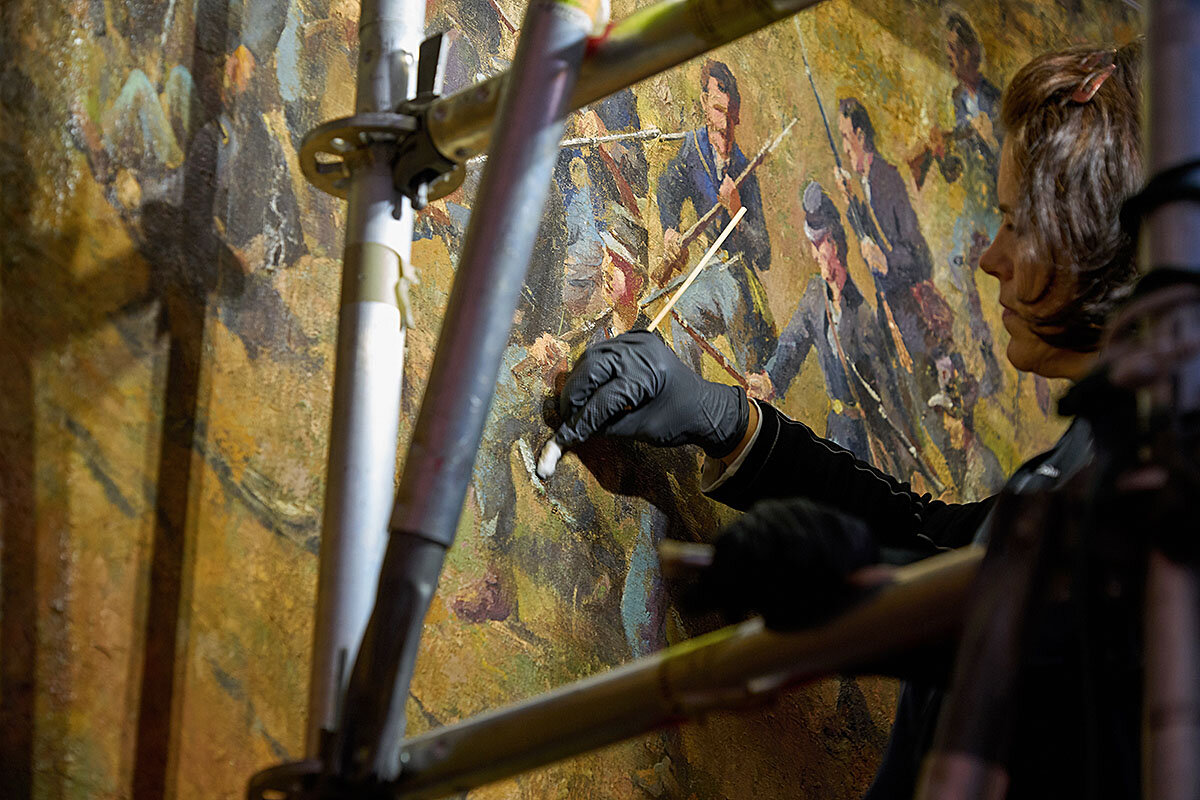 A golden eagle maneuvering across the battle field has been restored. A proper sky blue was laid down with oil paints, pulling the viewer deeper into the action. A retouched flag laying in the mud now bears its original Confederate insignia. And the Confederate prisoners once again wear gray.
