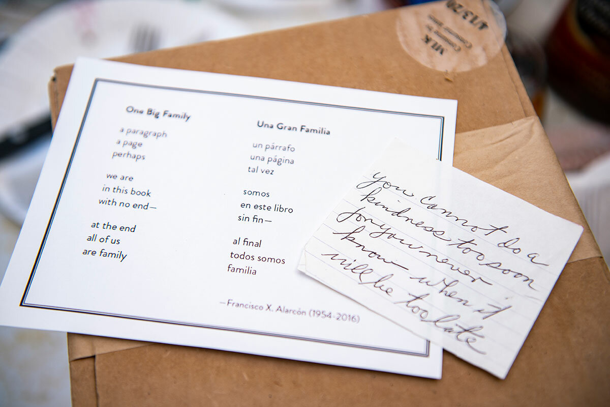Today Ms. Parry received another poem with her delivered meal, 鈥淯na Gran Familia鈥 by the Mexican American poet Francisco X. Alarc贸n, in Spanish with an English translation: a paragraph / a page / perhaps / we are / in this book / with no end 鈥 / at the end / all of us / are family.聽