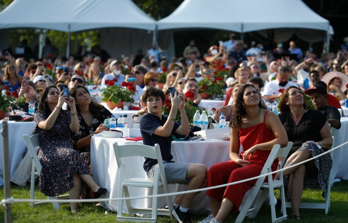 Many who showed up wore masks, unlike those seated close together for Mr. Trump's South Lawn event, and distancing was easy to do for those scattered across the sprawling space.