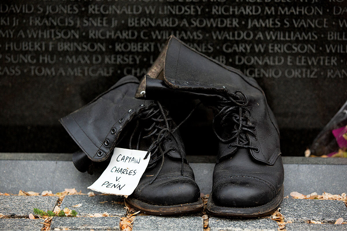 Slowly, we make our way to the National Mall’s hallowed western end, home to the Korean War Veterans Memorial, the Vietnam Veterans Memorial, and the Lincoln Memorial. At the Vietnam memorial, workers are repairing cobblestones beside the famous ebony wall, speaking Spanish, stretching caution tape for safety. We read messages people have left along the wall below the names, and we look at the little American flags stuck into inverted foam cups. Here and there are artifacts left like tributes. We see a carefully placed pair of boots – its uppers folded over, its polished leather creased from the feet of the man who had worn them. It’s quiet here.