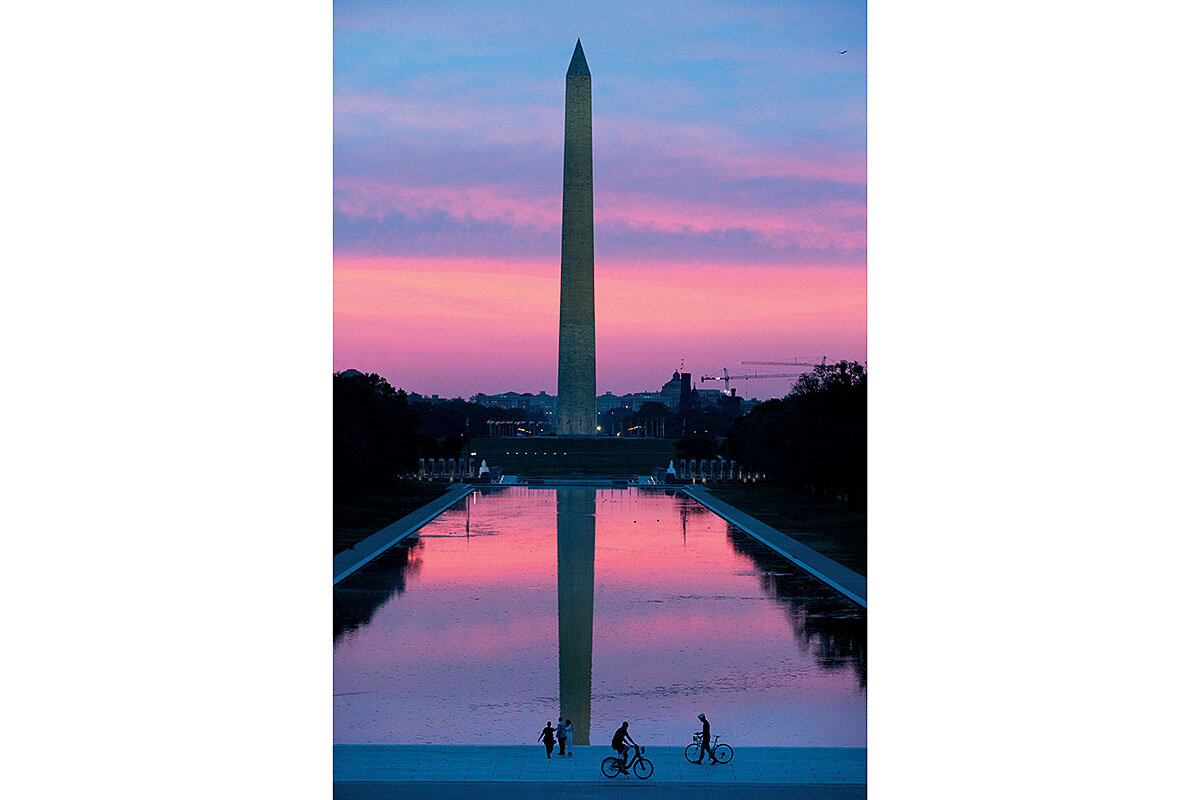 We begin at the beginning, the Washington Monument. We pedal our bikes toward it over the pathways of the National Mall and then up the broad mound that lifts the enormous obelisk above the landscape, encircled by flags. The day is brilliant. The flags crack in the wind. From here you see everywhere, your eye skipping over the roofs of the low-built city. The sky above is like a bowl turned over.