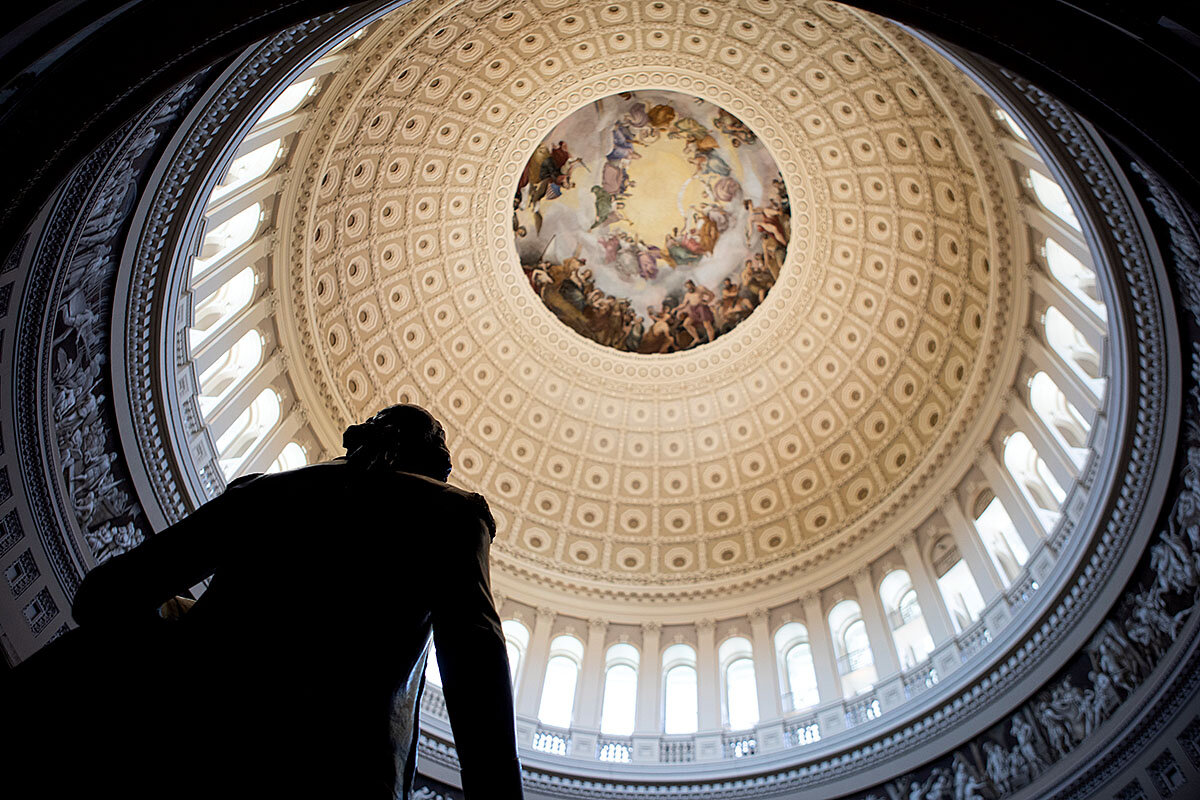 In the Rotunda, there is no one – no politicians or staffers racing back and forth towing journalists, no tourists milling in the gallery to gawk. The photographer has never seen it like this, and becomes quickly lost in taking pictures of the dome and the statues and the reflections on the tiles. There are always people here, she says. Always.