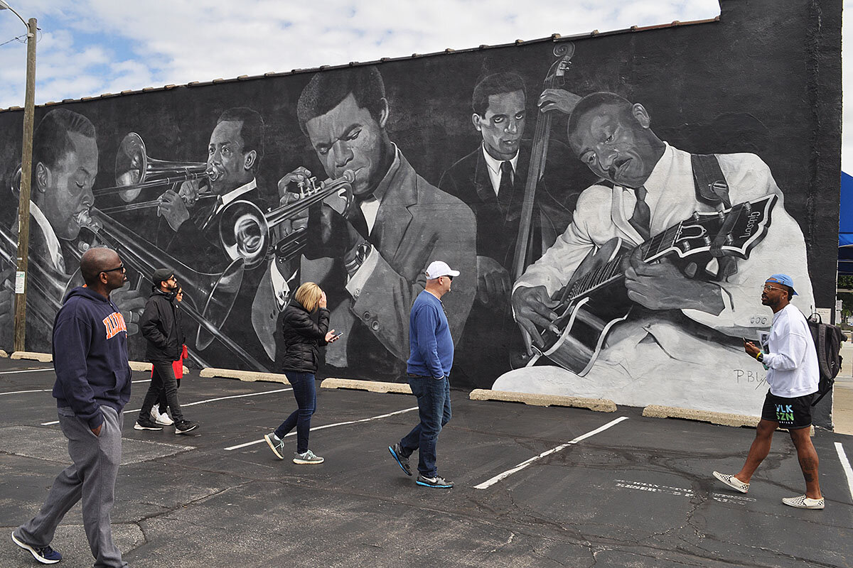 Almost a year later, on an unseasonably cold Memorial Day weekend that was less than ideal for barbecuing, but perfect for a brisk walk around Indianapolis, he gathers up the participants for his 96th tour. Nine people, a multiracial mix of locals and out-of-town visitors, huddle outside the Urban League of Indianapolis. Mr. Levingston greets them all with a smile. He carries a bundle of historic photos and a portable speaker so he can play the music of local jazz legends during the two-hour walk.