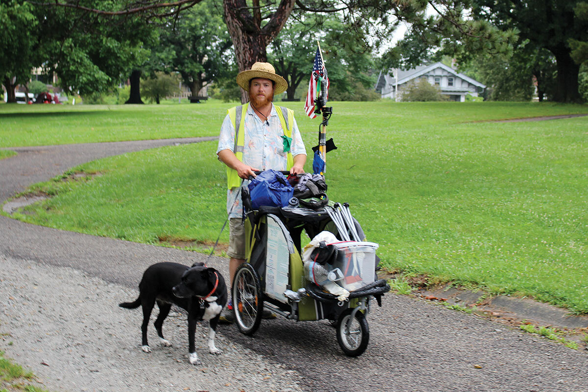 “It’s way harder than I thought,” he says at a stop just shy of Pittsburgh July 1. He pushes his 70-pound dog in a cart. “I figured it’d be a really great adventure for her, too,” he explains. “But now, I’m realizing she doesn’t care.”