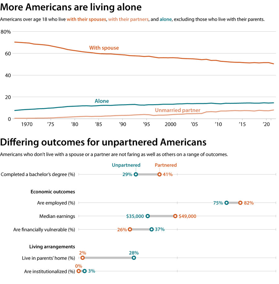 In 2020, nearly 4 out of 10 adults between ages 25 and 54 were neither married nor living with a partner 鈥 a 30% increase since 1990, according to a recent Pew Research Center . More significantly, the number of single-person households in the U.S. has doubled from 18.2 million in 1980 to 36.1 million today, or about 28% of the nation鈥檚 total, . An additionalhomes are headed by a single parent, the number in 1965.